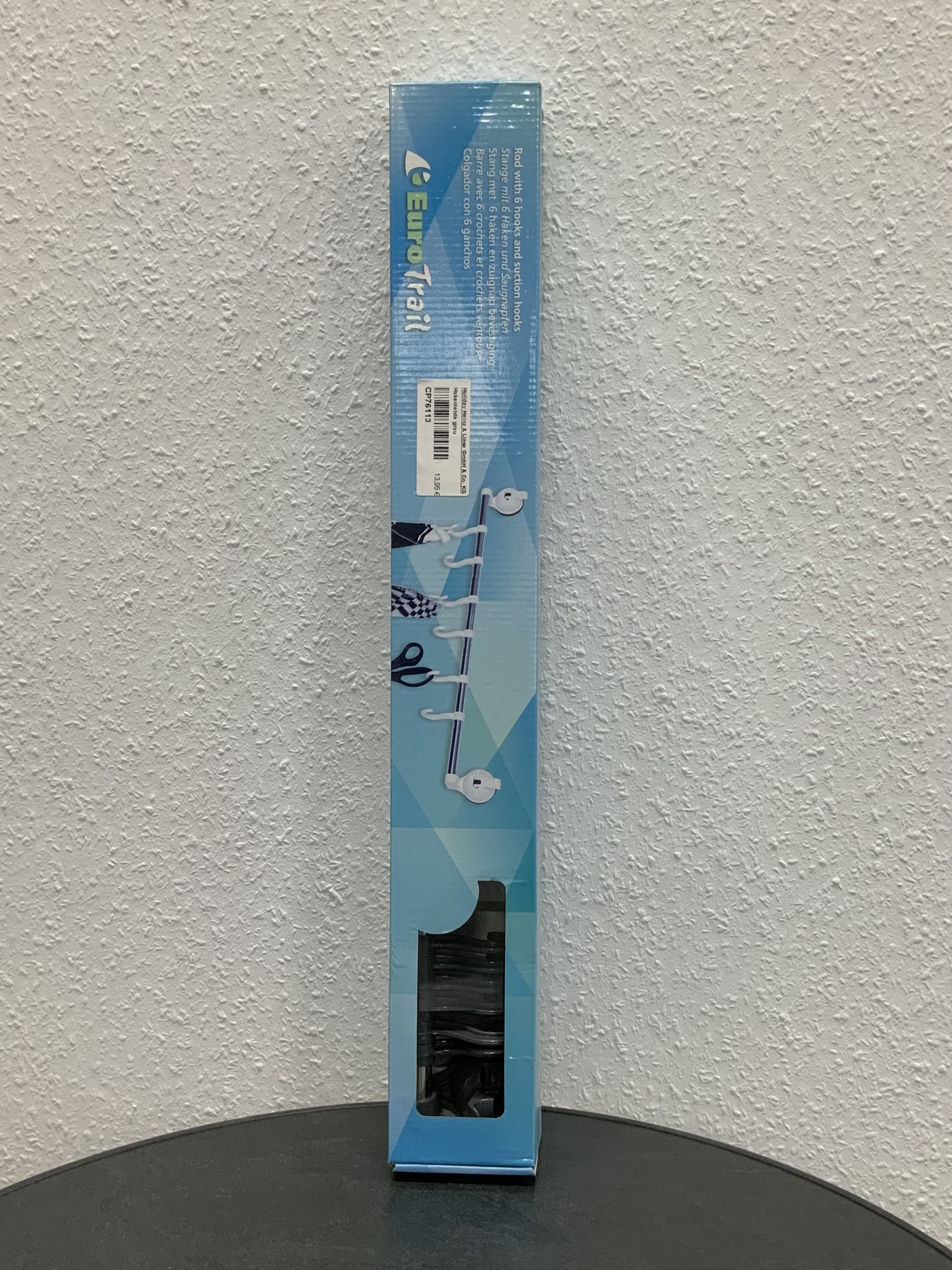 Dieser Stab ist mit 6 Haken ausgestattet.Ideal für Ihren Mantel oder Handtucher. Einfache Befestiging mittels zwei Saugnäpfe.