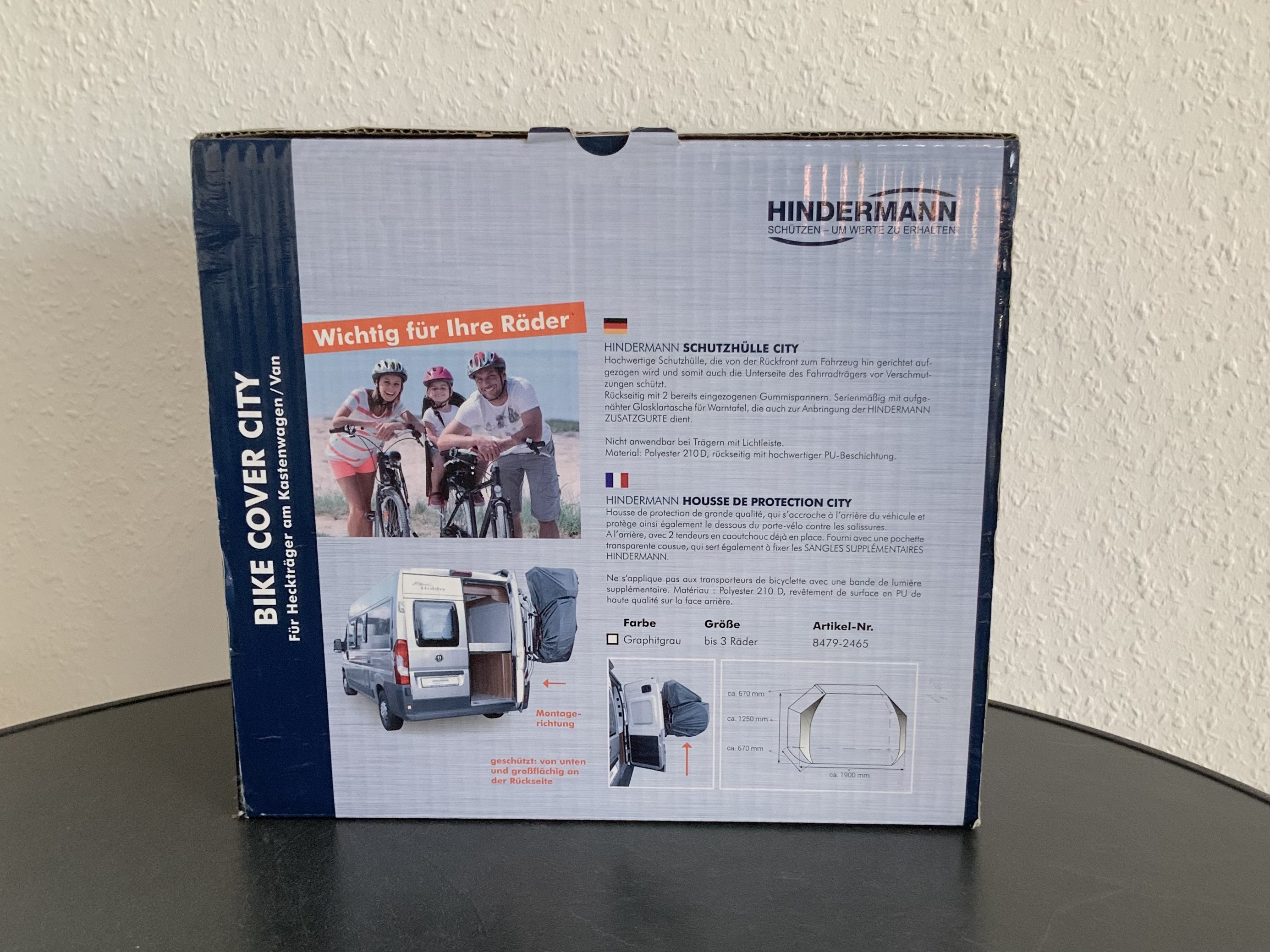 Die Schutzhülle für 3 Fahrräder wird von hinten aufgezogen und deckt auch die Unterseite des Trägers ab.